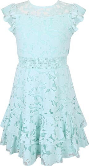 Your favorite partygoer will love to twirl in this fit-and-flare party dress featuring an eye-catching lacy overlay and a soft jersey lining.