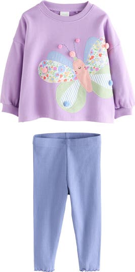 Perfect for playtime, this adorable cottony set pairs a butterfly appliquéd sweatshirt with coordinating ribbed leggings with lettuce-edge hems.