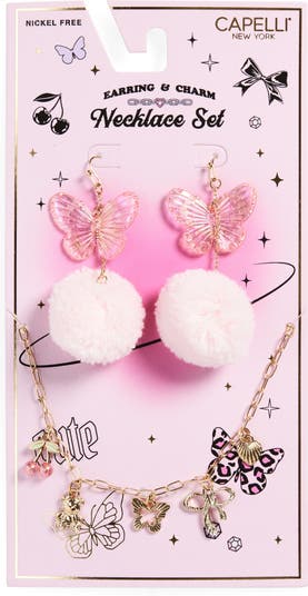 These playful pompom earrings and charm necklace are ready to put a whimsical spin on your aspiring fashion icon's look.