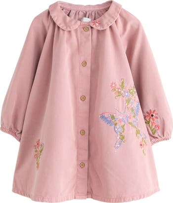 A butterfly and blooms are embroidered on a flowy nonstretch-denim shirtdress that's made extrasweet with volume-creating gathers and a Peter Pan collar.