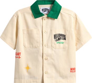 Logo-graphic detailing stamps the back and front patch pocket of this retro-inspired button-up shirt.