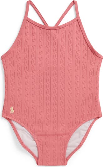 A mini cable-jacquard pattern lends tonal dimension to this precious little one-piece swimsuit made with a signature embroidered pony and crisscross straps.