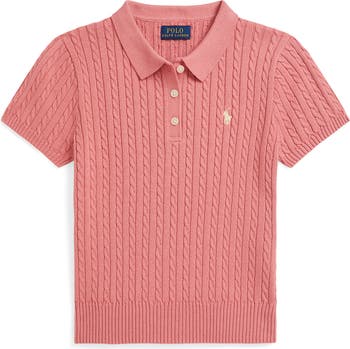 Preppy cable stitching textures a short-sleeve polo-sweater sized for kids and finished with an embroidered logo—iconic since its 1971 debut.