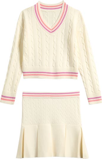 Your kid will love the preppy vibe of this sweater and skirt set featuring a classic cable stitched and color stripes.