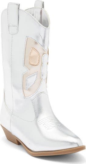 Their Western style will take flight in this shiny metallic boot fronted with a butterfly appliqué for kid-approved charm.