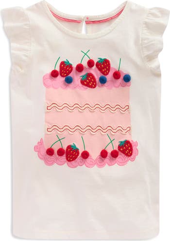 Your little trendsetter will adore this whimsical cotton T-shirt featuring a charming three-layer cake topped with fruit appliqués and framed by fluttery sleeves.