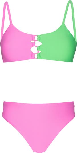 Loopy cutouts and candy-colored hues bring kid-approved style to this two-piece swimsuit ready for somewhere sunny.