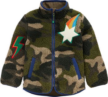 Thick, plush fleece patterned in camo greens and rainbow patches keeps your kid cold-weather comfortable in a jacket with a knit cotton lining providing an extra layer of warmth. The taller collar and cozy hand pockets provide added coverage when the wind blows and the temperatures fall.