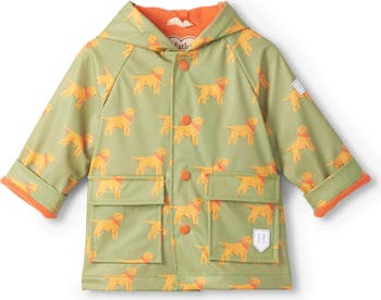 They'll be ready for puddle splashing fun each time they slip on this snap-closure rain jacket with a fixed hood and plenty of pockets for treasure hoarding.