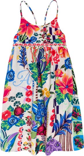 An elastic back panel guarantees a perfect fit every time they slip into this vibrant sundress, adorned with adorable crisscross straps.