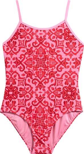 A vibrant tile print and contrast binding stand out on this one-piece swimsuit as they splash and play in the water.