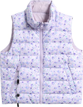 Your kiddo will be ready for cold weather with this water-repellent puffer vest insulated with plush down for temperature regulation and lightweight warmth. It's crafted with a reversible design that switches from a quilted, floral-print side to a smooth, solid contrast for two looks in one.