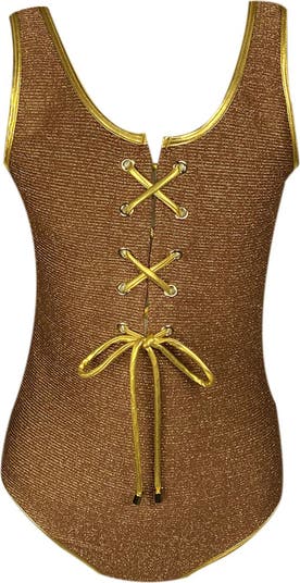 The gold piping detail adds a trendy touch, while this eyelet detailed sporty casual girl swimsuit is perfect for a day at the beach or pool. The eyelet details add a touch of elegance to the sporty design, making it versatile for any occasion and an open back design for extra comfort in the sun.