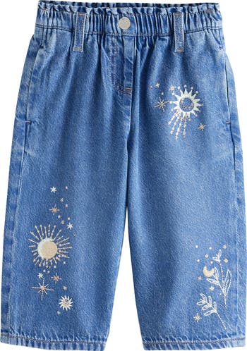 Lustrous crystals and a celestial pattern add out-of-this-world style to nonstretch barrel jeans that your young trendsetter will love to show off.