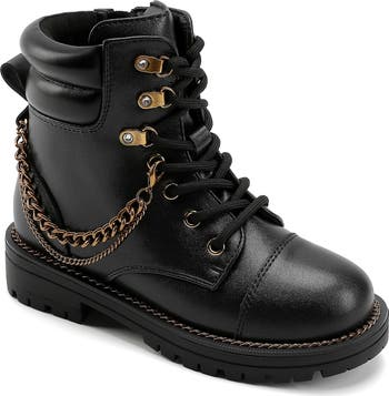 Your little trendsetter will love stepping into the statement-making style of this kid-sized combat boot that's draped with gleaming chains.