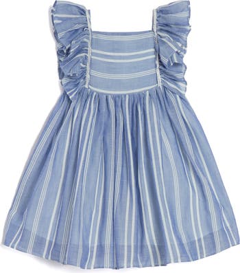 Ruffles frill the shoulders of this striped chambray dress featuring a skirt that's ready for them to twirl in.