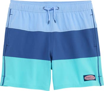 Handy pockets hold their treasures as they explore the shore in these colorblocked swim trunks with built-in sun protection.
