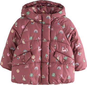 A ditsy print adds kid-approved flair to a cold-weather-ready puffer jacket topped with a roomy hood and lined in plush fleece to enhance their comfort and coverage.