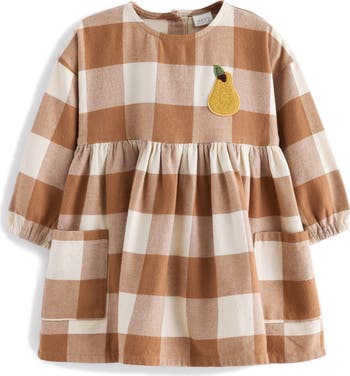 An appliquéd pear adds the finishing touch to an adorable cotton flannel dress covered in spicy gingham checks.