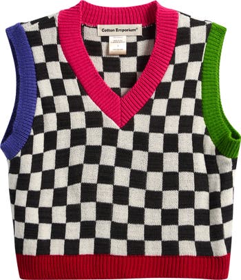 Your budding trendsetter will appreciate this season-spanning sweater vest featuring a wavy checkered pattern and colorblock ribbed trim.