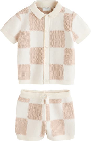 Textured checks pattern a darling knit set featuring a button-up top paired with coordinating elastic-waist shorts.