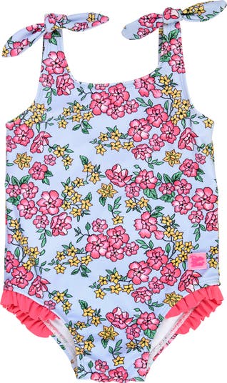 Watch your little adventurer make a splash in this floral one-piece swimsuit decorated with adorable bows and signature ruffles.