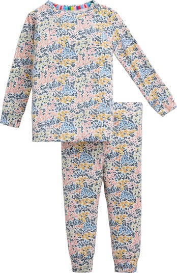 A vibrant floral print blossoms on these snug and cozy two-piece pajamas complete with a fuss-free magnetic closure.