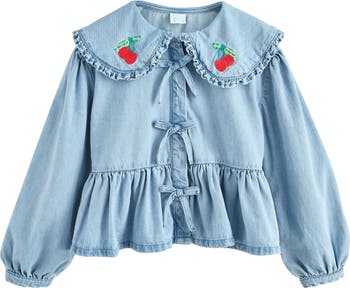 Embroidered cherries punctuate the ruffled collar of this simply sweet denim shirt with three perfect bows down the front.