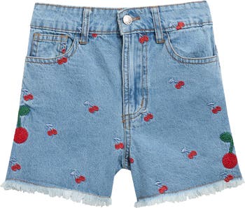 Sweeten their school-day looks with these cherry-embroidered shorts cut from nonstretch denim and finished with raw hems.