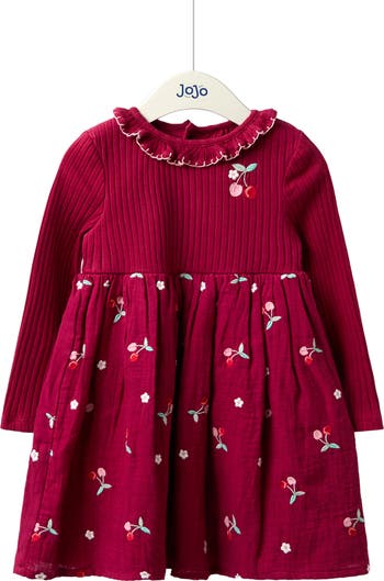 Embroidered cherries sweeten this long-sleeve dress that's equal parts frilly and twirly.