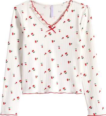 Playful cherry graphics and crisp contrast edging freshen this comfy cotton T-shirt designed for your big kid's standout style from class to after-school plans.