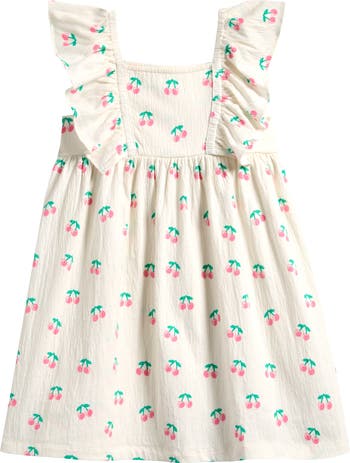Dual ruffles perfectly frame your little one in this airy crinkled-jersey dress bursting with cherry-sweet charm.
