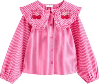 Your favorite social butterfly will love the ruffled collar of this breathable cotton top featuring sweet embroidered cherries and bold stripes.