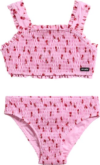 Your favorite youngster will be ready to splash and play in this ruffle-trimmed two-piece swimsuit made with a sweet cherry print and allover smocking.