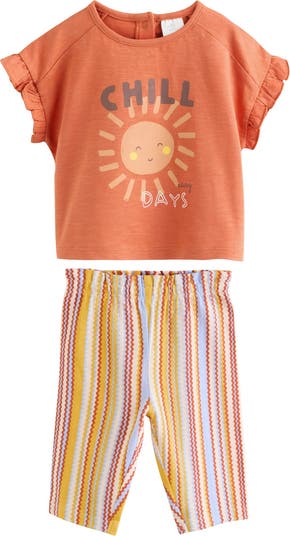 Keep your kiddo well-outfitted with this soft cotton set—including a ruffled graphic T-shirt and zigzag-striped pants—made to brighten even the dreariest days.