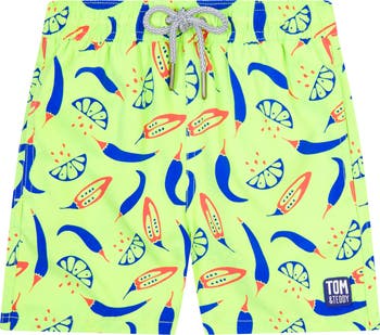 Your lil surfer will seek out the gnarliest waves in patterned swim trunks made from a quick-drying fabric and finished with a drawstring waist.