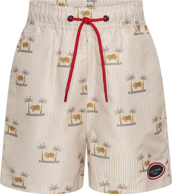 They'll be feeling comfortable on land and in the water wearing these microfiber swim trunks with built-in sun protection and handy pockets.
