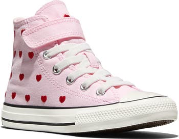 Embroidered hearts sweeten this iconic canvas high top reimagined for kids with stretchy laces and an adjustable strap for easy-on/off.