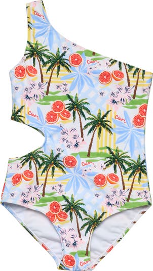 A sun-soaked Italian print brings vacay vibes to this colorful one-piece swimsuit designed with a playful side cutout and one-shoulder design.