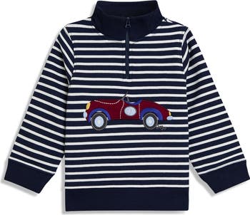 An embroidered appliqué of a vintage car and contrast elbow patches bring old-timey appeal to this striped, kid-sized quarter-zip pullover in soft cotton jersey.
