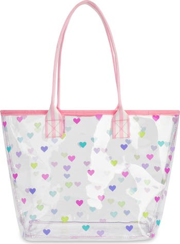 A colorful topline and a scattered hearts pattern highlight the translucent exterior of a spacious tote perfect for stylishly storing your kiddo's favorite on-the-go items.