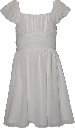 Allover clip dots add delightful texture to this twirl-ready dress with fluttery cap sleeves.