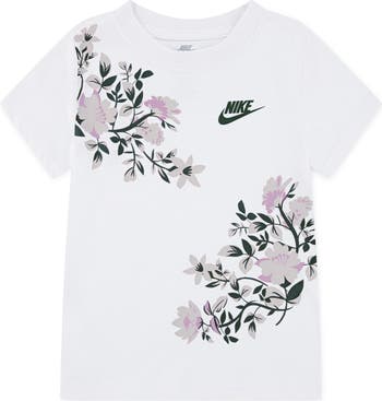 Delicate floral graphics sweeten the sporty vibe of this kid-sized cotton-blend T-shirt detailed with the iconic Nike Swoosh at the chest.