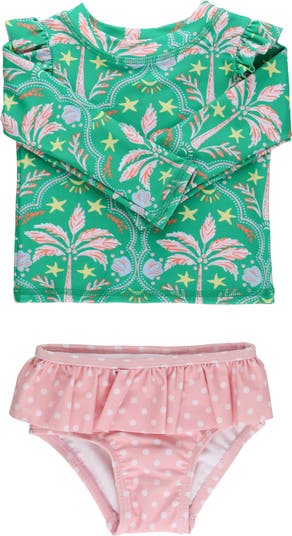 Long sleeves and built-in UPF 50+ keep their skin protected from the sun, sand and surf as they splash and play in this two-piece swimsuit with fluttery ruffles.