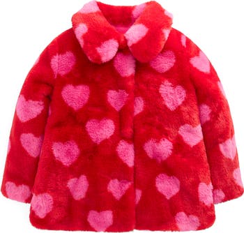 Plush faux-fur construction keeps your kiddo comfy and cozy in the cooler months when they top their look with this jacket patterned in sweet hearts.