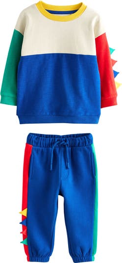 Bold colorblocking lends kid-approved charm to matching sweatshirt and joggers outlined with dimensional appliqués inspired by the spikes on a dinosaur's back.