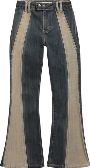 Angled contrasting panels and flared legs give a groovy throwback look to these vintage-wash denim jeans.