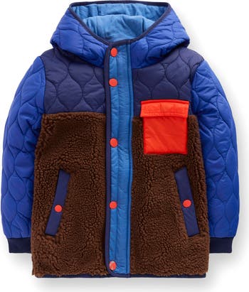 A colorful patchwork of onion quilting and high-pile fleece makes this hooded jacket a favorite throughout the school year.