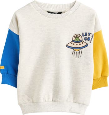 Your little star-gazer will scan the galaxy for mysterious phenomena in this colorblocked sweatshirt stamped with friendly looking fliers.