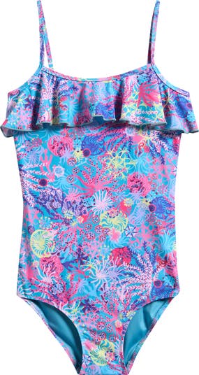 Frilly ruffles ensure your young beachgoer will look ultracute while they splash and play all day long in this printed one-piece.